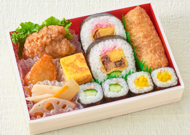 長年愛され続けている小僧寿しの元祖太巻きと自慢の舎利で作る細巻き(新香・胡瓜)とジューシーな味付けのいなり寿司の寿司盛り合わせに加え、マルキン醤油使用のからあげなどお惣菜が入った寿司弁当です。