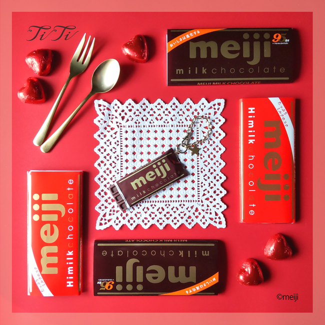 TiTiは、「明治ミルクチョコレート」「明治ハイミルクチョコレート」2つをモチーフにしたアクセサリーをご用意させていただきました。板チョコをそっくりそのまま模した「ブローチ」「ネックレス」「バッグチャーム」、3種のアクセサリーは裏面まで本物そっくりの仕上がり。特別なコラボアイテムに、是非ご注目ください!