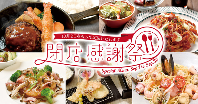 長年のご愛顧に感謝を込め、各店舗9月1日(木)〜30日(金)の期間限定で特別メニューを販売いたします。従業員一同、最後まで元気に営業いたしますので、是非ご利用くださいませ。
