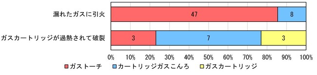 『漏れたガスに引火』した事故55件、『ガスカートリッジが過熱されて破裂』した事故13件について、それぞれの製品別の事故発生件数を図3に示します。製品別で見ると、『漏れたガスに引火』した事象は「ガストーチ」で多く発生し、『ガスカートリッジが過熱されて破裂』した事象は「カートリッジガスこんろ」で多く発生しています。