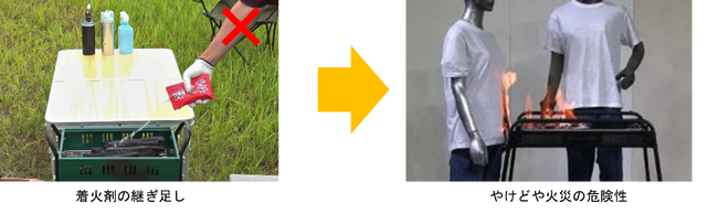 すでに火が点いている炭に着火剤を継ぎ足した場合、大きな炎が上がり、やけどや火災に至るおそれがあります。絶対に着火剤の継ぎ足しはしないでください。特に、ゼリー状の着火剤の主原料は揮発性が高く、青白い炎で見えにくいため、注意が必要です。
