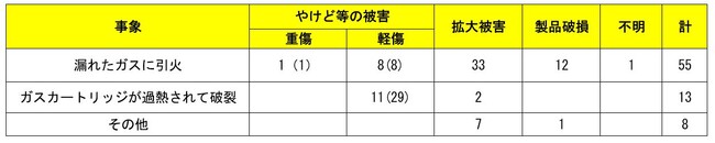 ガス製品の事故154件のうち、調査が完了して原因が判明している76件の事故を対象に、事象別・被害別の事故発生件数を表1に示します。ガス製品の事故事象は大きく『漏れたガスに引火』、『ガスカートリッジが過熱されて破裂』の2つに分けられます。事故件数が多い事象は『漏れたガスに引火』で、やけど等の被害と被害者数が多い事象は『ガスカートリッジが過熱されて破裂』となっています。