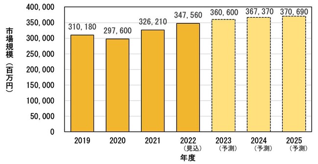 注:アウトドア用品・施設・レンタル市場は、アウトドア用品(アパレル・用具)市場とアウトドア施設市場、アウトドア用品レンタル市場の合算値。アパレル市場及び用具市場は、メーカー出荷金額ベースで、施設市場は宿泊費を含む施設利用料ベース(施設でのレンタル料や物販売上高は含まない)で、レンタル市場はアウトドアレンタル事業者及び施設運営事業者のレンタルサービス利用料ベースで算出した。2022年度は見込値、2023年度以降は予測値。