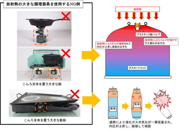 カートリッジガスこんろに対して、こんろ全体を覆うような大きな鍋や鉄板などの放射熱の大きな調理器具は使用しないでください。鉄部からの放射熱(鉄部から発生した熱)によってガスカートリッジが過熱され、内圧上昇によりガスカートリッジが破裂するおそれがあります。また、プラスチック製バルブが溶けると、ガス漏れが発生することで引火につながったり、引火した炎がガスカートリッジをさらに過熱することで破裂につながったりするおそれもあります。