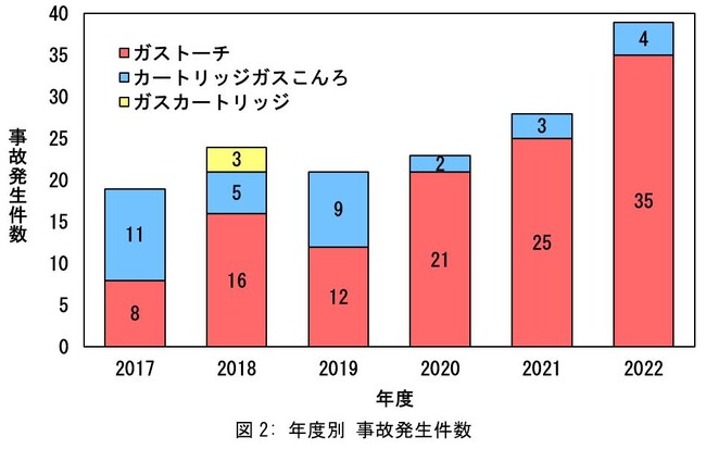 NITE に通知された製品事故情報のうち、2017 年度から 2022年度に発生したガス製品の事故 154件について、年度別の事故発生件数を図2に示します。2020年度以降、増加傾向にありますが、特にガストーチの事故件数が増加しています。バーベキューやキャンプでの火おこしや炙り料理などで使用される機会が増えたことと、海外製の粗雑な作りの製品が市場に多く出回ったことが要因と考えられます。