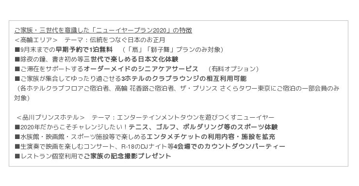 今年の年末年始は、最大9連休と日並びが良く、令和最初のお正月でもあることから、旅行意欲の高まりが予想されます。そこで、長期滞在が見込まれる三世代に向け、高輪エリアは「伝統をつなぐ日本のお正月」をテーマに、1泊無料の早期予約キャンペーンや3ホテルのクラブラウンジ相互利用、シニアケア等、家族揃ってのご滞在をサポートするサービスを充実させました。一方、ファミリー需要の高い品川プリンスホテルは、「エンターテインメントタウンを遊びつくすニューイヤー」をテーマに、国際大会開催で注目の高まるスポーツ体験等小さなお子さまも楽しめるイベントの他、水族館や映画館等で利用できるエンタメチケットの内容を拡充します。