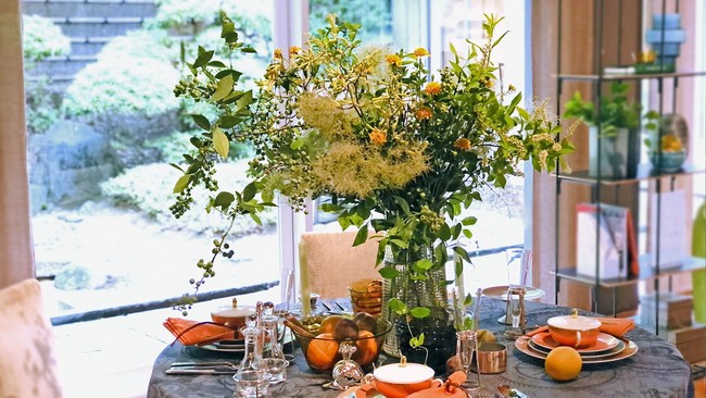 会場内の “ミックスエリア”は、インテリアスタイリストの中田由美氏が監修をされて、参加ブランドをひとつの空間世界に演出してご覧いただけるスペースです。ダイニングテーブルの上には煌びやかな食器やカトラリーと調和するように差し色としてテーマカラーのオレンジ色が加えられています、背後の中庭を借景として調和するように、ふんだんにグリーンを使った組み合わせでコーディネートを作成しました。