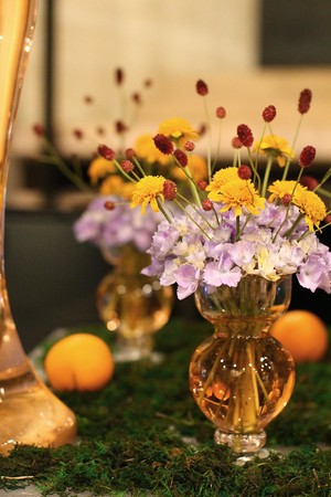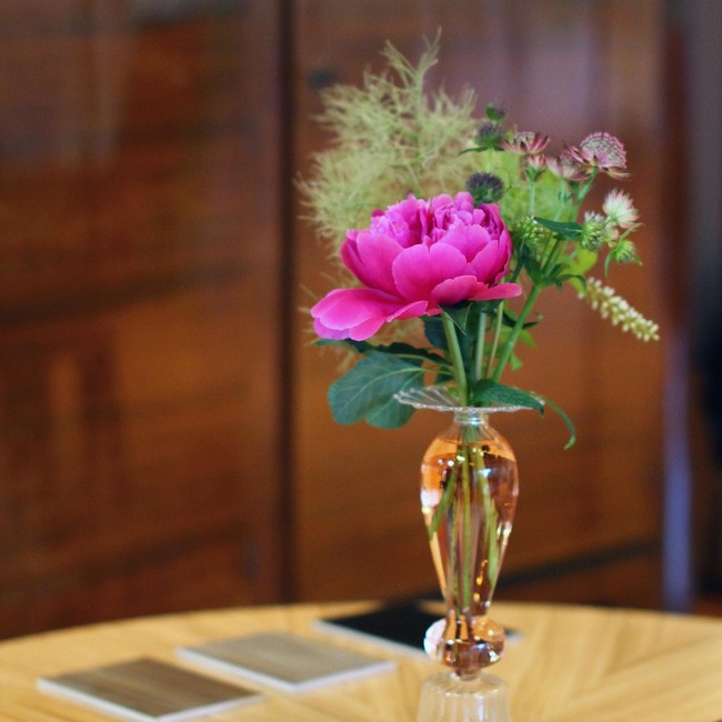 イベントのメインビジュアルが大型のパネルになってお客様を迎えるエントランスホールには、パネルのビジュアルカラーにイメージを合わせた装飾を用意。エルベ・シャトランの特徴である「ビジュー」の演出で、透明なガラス花器に淡くオレンジ色に着色した水を用いています。フレッシュなオレンジの実を主役にして力強くエネルギッシュなメインビジュアルからインスパイアされたデザインになっています。足元には公邸の庭をイメージして苔を敷き、小さな小瓶には旬のアジサイを咲かせました。