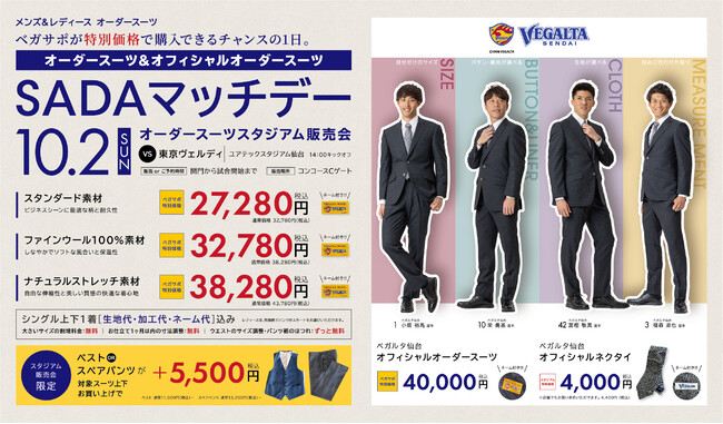 「ベガルタ仙台」SADAマッチデー 10月2日(日)開催!オフィシャルスーツ予約販売会&ガラガラ抽選会をおこないます。