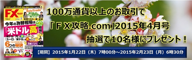 キャンペーン期間において新規で100万通貨以上お取引されたお客様で、申込みフォームよりお申込み頂いたお客様の中から抽選で10名様に月刊FX情報誌「FX攻略.com」(2015年2月21日発売)をプレゼント致します。