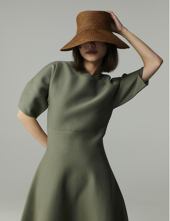 Iラインに一見見えるシルエットは、女性らしいしなやかな曲線を見せるためにややAラインに仕上げています。