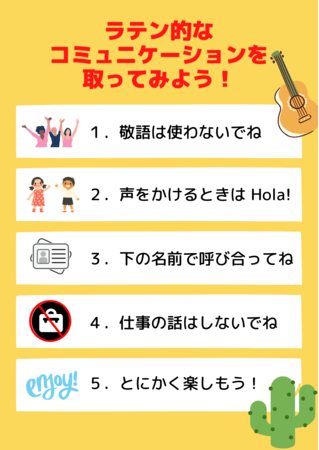 ラテンならではの「どんな時でも楽しめるマインド」と「自分と人の良さに気づける会話の仕方」(ラテン的な習慣とコミュニケーション法)を体験を通じて学んでいきます。