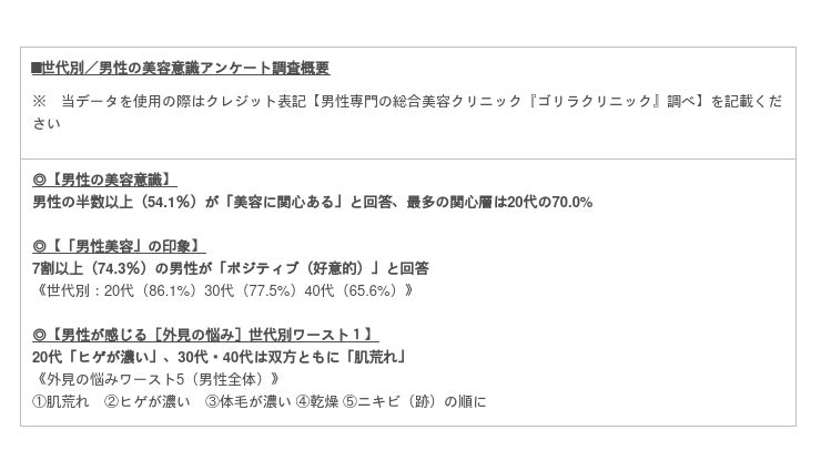 なお、ゴリラクリニックでは2023年2月17日から19日の3日間、当院でも来院比率の高い20〜49歳の男性2,106名を対象に『世代別/男性の美容意識調査(インターネット調査)』を実施。調査結果も開示いたします。(詳細は添付のPDFデータ、ならびにスクロール下を参照ください)
