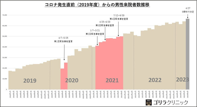 全国に22院展開する男性専門の総合美容クリニック『ゴリラクリニック』(医療法人社団十二会・東京都新宿区・総院長 稲見文彦)の場合、上記のグラフの通り、1回目の緊急事態宣言が発令された2020年4月・5月は不要不急の外出自粛やテレワークの活用もあり来院者数はいったん落ち込むものの、翌6月には回復。