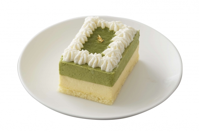 スポンジ、白ゴマムース、抹茶ムースを重ね合わせ、抹茶ソースとシャンティ(ホイップクリーム)でデコレーションしました。