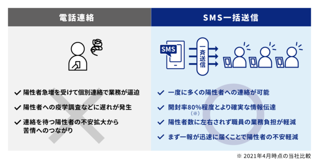 新型コロナウイルス陽性者への連絡の際、電話を主な連絡手段として利用されていましたが、陽性者急増を受けて個別連絡で業務が逼迫、陽性者への疫学調査などに遅れが発生、連絡を待つ陽性者の不安拡大から苦情へのつながり、などといった課題が生じていました。