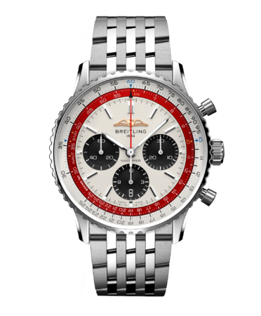 ナビタイマー ボーイング747は12時位置のAOPAのロゴが特徴。パイロット用クロノグラフとしての伝統を表しています。ダイヤルのカラーは、ボーイング747初号機のカラーリングを踏襲しています。クリームのダイヤル、ブラックのサブダイヤル、レッドとホワイトの計算尺にはブルーのアクセント。内側計算尺にはさりげなく「Boeing 747」の名前が入っています。6時位置の日付窓も、特徴の一つ。ブラックのアリゲーターレザーストラップまたは、7連メタルブレスレットからお選びいただけます。