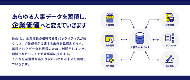 「ジンジャー」は、人事労務・勤怠管理・給与計算・ワークフロー・経費精算・電子契約など、バックオフィス業務の効率化を支援するクラウドサービスです。バックオフィスに関わるデータを「ジンジャー」に集約し、「1つのデータベース」で管理することで、各サービスにおける情報登録や変更の手間を削減します。