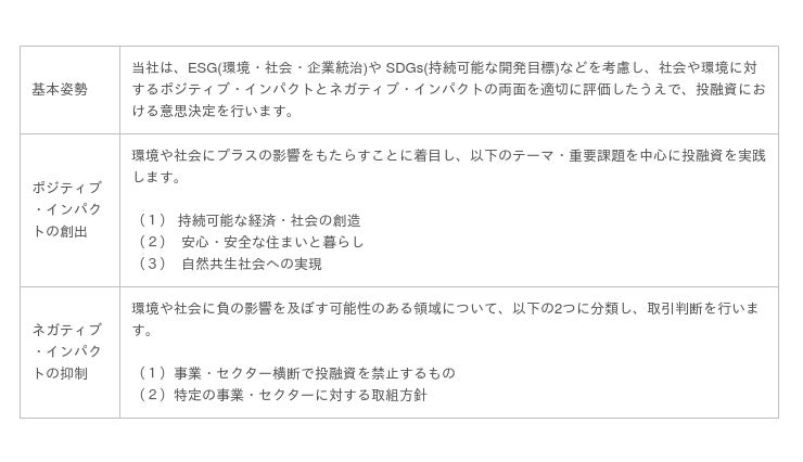 当社は、2021年7月、社会に貢献する姿勢や理念、経営の方向性を明確化するために、「サステナビリティ方針※」を制定しました。この方針に基づく本ポリシーでは、当社の投融資について、社会や環境への影響をポジティブ・インパクトの創出とネガティブ・インパクトの抑制の2つの観点から適切に評価したうえで判断を行います。今後、全ての投融資において本ポリシーを活用し、持続可能な社会の実現に貢献してまいります。