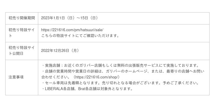 またキャンペーンに先立ち、2023年12月26日(月)から、Webにて先行特設ページを公開いたします。先行特設ページでは、厳選した初売り在庫をご確認いただける他、来店日程のご予約を承ります。先行公開ページは特設サイト(https://221616.com/pm/hatsuuri/sale/)より、ご確認いただくことが可能です。