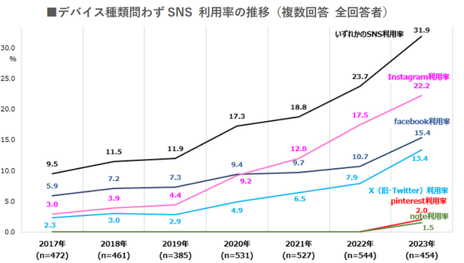⇒インスタグラムだけでなくfacebook、X(旧・Twitter)、の利用率も上昇した。その他では、Pinterestやnoteの利用率は、それぞれ2.0%、1.5%とまだまだ低いレベルである。