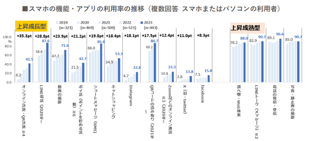 オンライン決済・QR決済41.5%(+35.3ポイント)、LINE電話87.6%(2020年~ +28.8ポイント)、動画の撮影71.6%(+23.9ポイント)、ポイ活42.7%(+21.2ポイント)である。