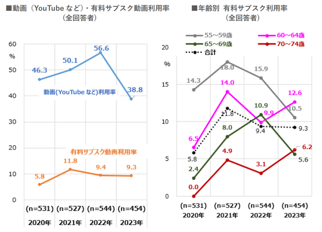 ・有料サブスク動画の利用率は、昨年比-0.1ポイントの9.3%(42名)と、ほぼ同レベルをキープ。また、有料動画は、特に55〜59歳の利用率の低下が目立ち、昨年比-5.4ポイントの10.5%となった。