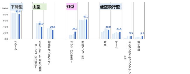コロナ前〜コロナ禍〜コロナ後の視点で経年トレンドを追うと、上昇、横ばい、下降がはっきり見えました。その傾向を”上昇成長型”、”上昇成熟型”、”下降型”、”山型”、”谷型”と名付けました。”上昇成長型”は「オンライン決済」「LINE電話」「動画の撮影」「ポイ活」「SNS」「ネットショッピング」「Instagram」「Zoomなどのオンライン通話」など、”上昇成熟型”は「調べ物・Web検索」「LINEトーク(メッセージ)」「電話の受発信」「写真静止画の撮影」。「SNS」「Instagram」「LINEトーク」は”下降型”となった「Eメール」からとって代わったと言えそうです。”山型”の「YouTubeなど有料の動画サービス」「健康管理」はコロナバブルがあった、「ラジオ」「地図アプリ」は外出先で活用されていると推察できます。