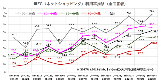 ・2023年のEC利用率は、過去最大の52.0%(236人)。年齢別では、55〜59歳は72.4%と利用率が高く、70〜74歳は昨年比+9.4ポイントと伸長が大きく、37.1%が利用経験ありと回答している。