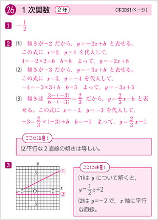 準備ができたら、右ページの「基本問題」を例題の解き方と同じように解いていきます。数学では、問題を解いていく過程がとても大切ですので、途中の式もきちんと書く習慣をつけて、解き終えたら別冊の「解答」の解き方と比べて、どこでどのようにまちがったのかをチェックしていくと効果的です。