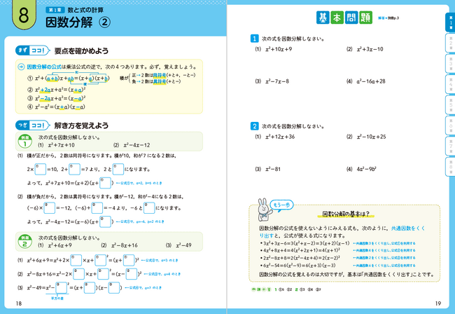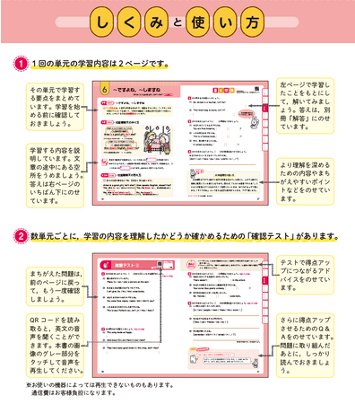---●基礎から無理なく力がついていく!数学は「まずココ!」「つぎココ!」の2段階、英語は「まずココ!」「つぎココ!」「さらにココ!」の3段階で、例題や穴埋め問題で重要事項や問題の解き方をインプットします。教科書レベルの「基本問題」「確認テスト」では、実力が身についたかどうかを確認することができます。