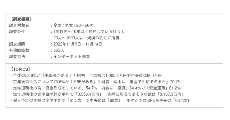 Job総研では565人の社会人男女を対象に、退職金の有無やその金額、また定年退職後の不安有無とその理由や、定年退職後の為に資産形成をしている率と定年までの目標資産額及び、現実的に形成できる資産額、そして何歳まで現役で働きたいかなどについて調査した「2022年 収入と支出の実態調査」を実施しました。
