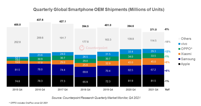 出典: カウンターポイント社Quarterly Market Monitor, Q4 2021