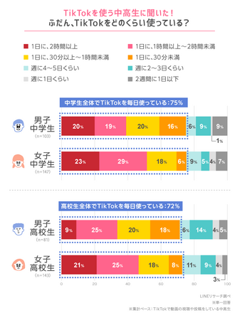TikTokを使っている中高生のうち、毎日使っている中学生は75%、高校生は72%