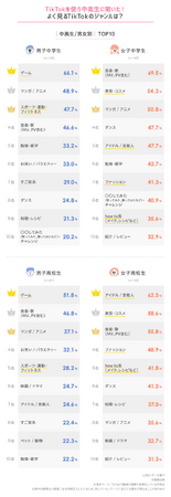 TikTokを使っている中高生に、よく見るTikTokのジャンルを聞きました。全体的に、女子のほうが男子よりも各項目の割合が高い傾向がみられました。また、ランキングでは中高生ともに男女で違いがみられました。