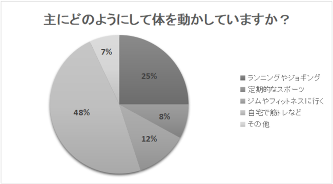 綺和美では、「主にどのようにして体を動かしていますか?」というアンケートを行いました。すると、一番多かった回答は「自宅で筋トレなど」で48%でした。