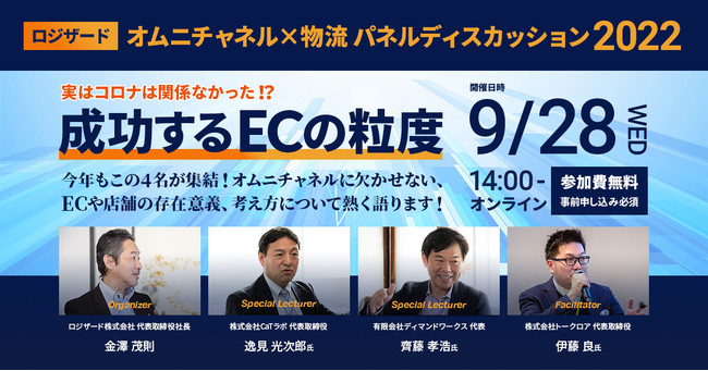 クラウド型在庫管理システムのリーディングカンパニーであるロジザード株式会社(東京都中央区、代表取締役社長:金澤 茂則、以下:ロジザード)は、『ロジザード オムニチャネル×物流パネルディスカッション 2022 〜 実はコロナは関係なかった!?成功するECの粒度 〜』の開催を決定、お申し込みの受付を開始しましたのでお知らせいたします。