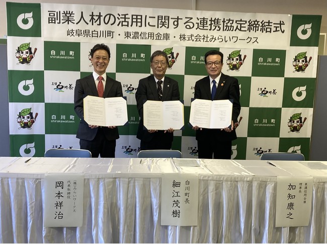 株式会社みらいワークス(本社:東京都港区、代表取締役社長 岡本祥治、以下「当社」)は、人材支援による地域企業の事業強化ならびに関係人口(※1)創出を目的とし、岐阜県加茂郡白川町(町長 細江茂樹)、白川町商工会(会長 長尾達美)、東濃信用金庫(理事長 加知康之)と、副業プロ人材の活用を推進することをお知らせいたします。