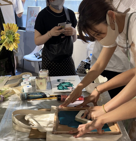 「シルクスクリーン」って聞くけど、体験したことありますか?アーティストのKaname.Tの原画をトートバッグにプリント体験ができます。好きな絵の具を選んで、自分色の花を刷ってみてください。当日エコバッグやTシャツを持ち込んで、好きな場所に刷ることも可能です。