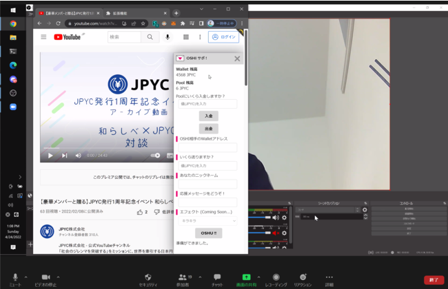 『JPYCで推しを救いたい』というスローガンで、ライブ配信に連動してJPYCを投げ銭できるサービスを提案されました。Chromeエクステンション「OSHIサポ!」を使用したデモでは、OBS Studioで配信している「推し」にJPYCでチップを送ると、動画上に送られてきたことがコメントと共に表示される様子が披露されました。