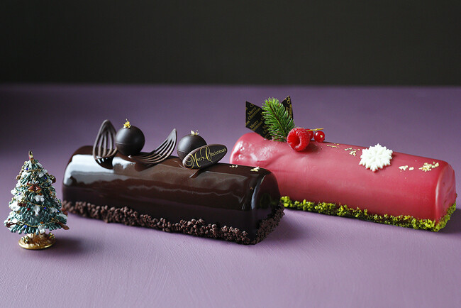さらに、少人数にもぴったりな大きさで、シックな装いに仕上げた“ブッシュ・ド・ノエル” をご用意しました。“プレザント”をベースにフランボワーズショコラをグラサージュした“苺と柚子のブッシュ・ド・ノエル”と、チョコレートムースの中にトンカ豆で香りづけした濃厚なカスタードクリームとほろ苦いコーヒーのジュレを閉じ込め、上品な甘さに仕上げた“チョコレートのブッシュ・ド・ノエル”の2種類。赤と茶色の色言葉、「愛」や「ぬくもり」をテーマに作り上げたケーキは、大切なパートナーと、また女性同士のお集まりなどにおすすめです。
