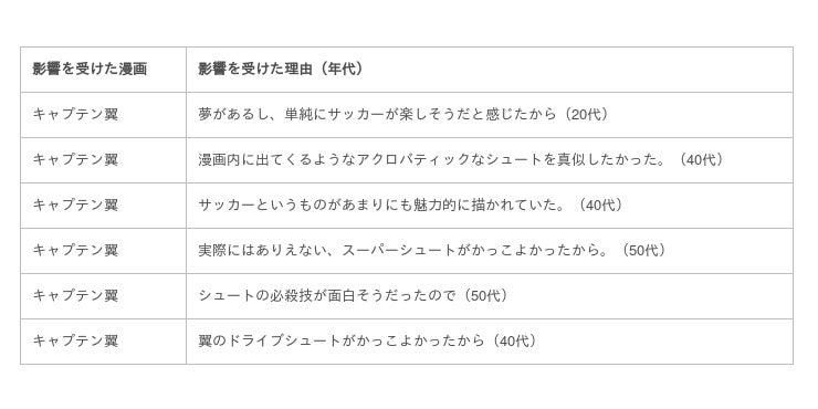 漫画単体で見ても、今回の調査では「キャプテン翼」を挙げた方がもっとも多く、幅広い世代に広く影響を与えているようです。