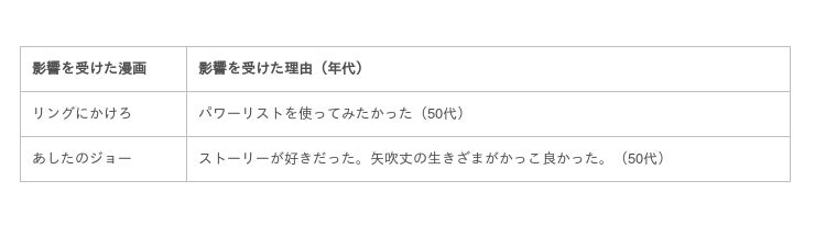 一方で40代以下の方は「サッカー」「バスケットボール」「テニス」を始めた方が多く、「キャプテン翼」「スラムダンク」「テニスの王子様」などの影響を大きく受けていました。