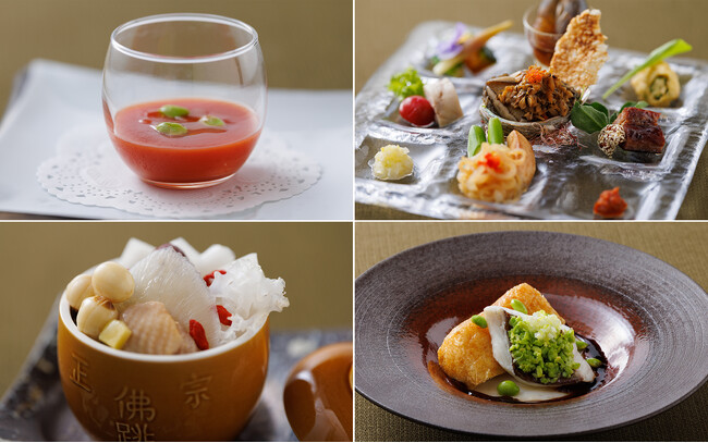 ○お料理コース トマトのガスパッチョ 枝豆を浮かべて 新潟県産食材をふんだんに使用した七種冷菜パレットスタイル 新潟県産越の鶏の旨味たっぷりフカヒレ入り壺蒸しスープ 新潟県産真鯛の広東式蒸し物 栃尾のあぶらげ添え コシヒカリと枝豆のココナッツ粥と共に 山古志産にいがた和牛サーロインのグリル やわ肌ねぎソース または 活カナダ産オマール海老(1/2カット)の鉄板焼き アスパラソース 季節の味覚を盛り込んで ビューホテルメイド穂乃華のパン イチゴのエクレア 新潟産酒粕の香りで