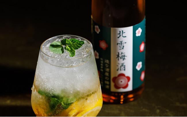 ○梅酒のモヒート 佐渡島で収穫された大粒の青梅だけを使用した“北雪梅酒”で作ったモヒートです。甘さのある梅酒にレモンの酸味をプラスした、爽快感が溢れるカクテルです。 ¥1,800