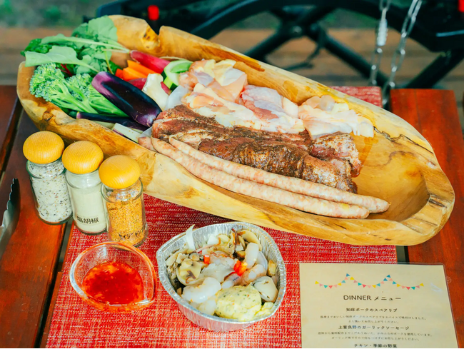 「知床豚スペアリブ」「上富良野ポークソーセージ」「おいしい野菜の会・地産野菜盛り合わせ」に加え、今夏より、芦別産「ななつぼし」のおにぎりも追加。「ガーリックシュリンプ」などの海鮮メニューも用意されており、普段自宅ではなかなか作る機会がないような、グランピングらしい非日常感のあるメニューを多数ご用意しております。