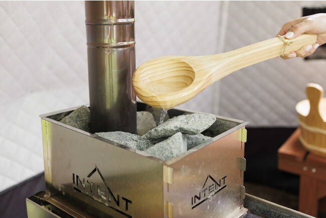 お好きな香りのアロマウォーターで、セルフロウリュを行えば、テント内はたちまち100℃まで上昇。1組ずつのご案内のため、完全なプライベート空間でのテントサウナをお楽しみいただけます。薪やロウリュでお好みの湿度や温度に調整していただけるのもうれしいポイント!