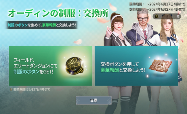 イベント期間中、「フィールド」及び「エリートダンジョン」内の一般モンスターより獲得できる「制服のボタン」を集めると報酬と交換することができます。