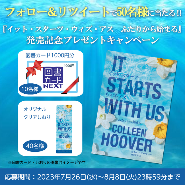 『イット・スターツ・ウィズ・アス ふたりから始まる』の発売を記念して、コリーン・フーヴァーの日本ファンアカウント(@colleenhooverjp)にて「図書カード」「オリジナルクリアしおり」が抽選で合計50名様に当たるX(Twitter)プレゼントキャンペーンを開催いたします。