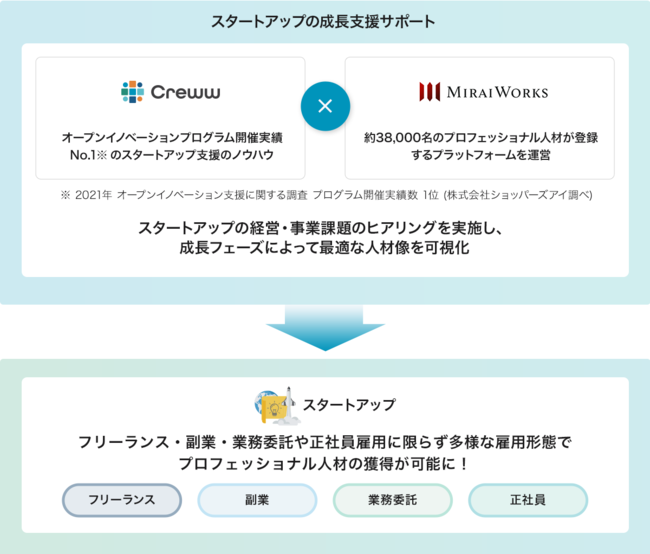 Crewwのスタートアップ支援のノウハウ・知見と、当社のプロフェッショナル人材ネットワークを連携することで、Crewwのグロース企業向けソリューションに、企業のフェーズによって必要な人材をフリーランス・副業等の業務委託や正社員といった多様な雇用形態で支援する仕組みが組み込まれ、グロース企業の成長を総合的に支援する体制が実現されます。本事業は、2022年6月を目処に提供開始を予定しております。